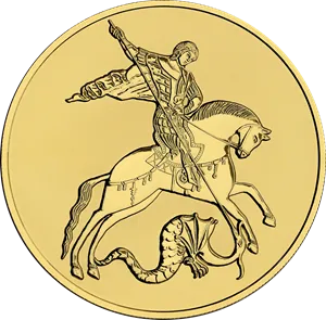 Реверс: рельефное изображение Георгия Победоносца на коне, поражающего копьем змея.