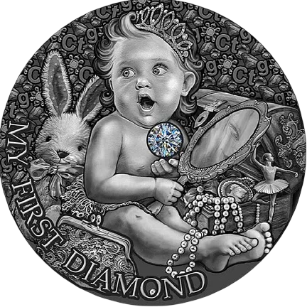 Эта серебряная монета представляет первый бриллиант, который попадает в руки ребенка. Монета имеет замечательный дизайн с красивой вставкой из драгоценных камней и имеет качество Proof. Она поставляется в футляре вместе с сертификатом подлинности. Ограниченный тираж - всего 1000 штук по всему миру!
