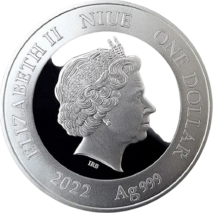 На аверсе монеты изображен портрет Ее Величества Королевы Елизаветы II и надписи: "ELIZABETH II" - имя королевы, "NIUE" - страна выпуска, "2022" - год выпуска, "Ag999" - чистота серебра и "ONE DOLLAR" – номинал.