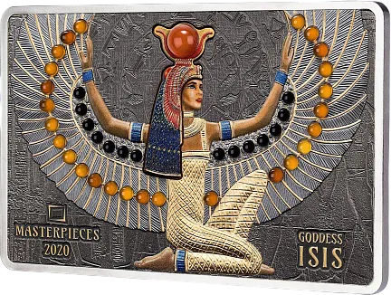 Этот невероятный выпуск Соломоновых Островов на самом деле представляет собой две монеты категории «пруф» в одной: сначала 200-граммовая серебряная монета 999 пробы, а за ней следует 12-граммовая золотая монета 999 пробы, являющаяся законным платежным средством, с инкрустацией, изображающей невероятное сходство с египетской богиней Изидой. Все драгоценные камни отшлифованы вручную, а части монеты покрыты золотом 9999 пробы высочайшего качества, а ее крылья облагорожены черным родием — самым ценным драгоценным металлом в мире.