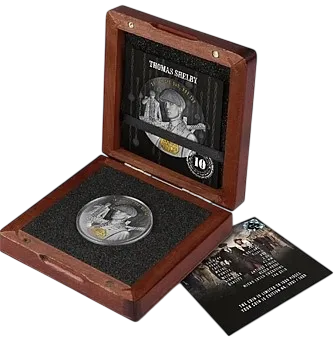 Эта элегантная серебряная монета весом 2 унции посвящена Томасу Шелби, почитаемому лидеру и самому влиятельному члену семьи Шелби, и является первым выпуском новой серии "Peaky Blinders"! Монета имеет качество Antique Finish, черное пробное покрытие и микролазерную гравировку. Она также частично покрыта золотом с ультравысоким рельефом. Монета поставляется в футляре вместе с сертификатом подлинности. Ограниченный тираж - всего 1.000 штук по всему миру.