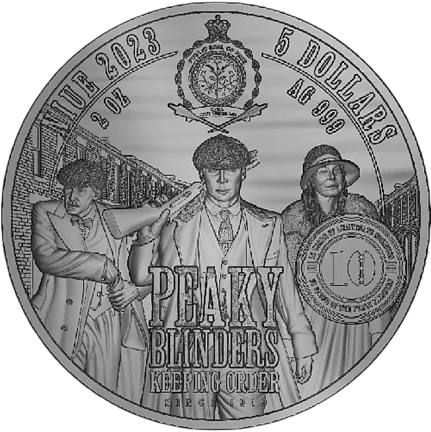 На аверсе - сцена из шедевра с надписями: "NIUE 2023" - страна и год выпуска, "5 DOLLARS" - номинал, "AG 999" - чистота серебра и "PEAKY BLINDERS KEEPING ORDER SINCE 1919".