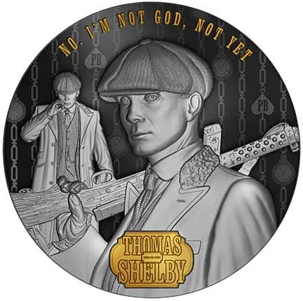 На реверсе монеты изображен Томас - организатор преступной деятельности семьи, включающей букмекерство, нелегальные азартные игры и рэкет. Он немногословен, но когда он говорит, то привлекает к себе внимание! Реверс монеты сообщает о позолоченной гравировке: "NO, I'm NOT GOD, NOT YET" - знаменитая фраза из гангстерской драмы Peaky Blinders, а ниже - позолоченная область с именем персонажа.