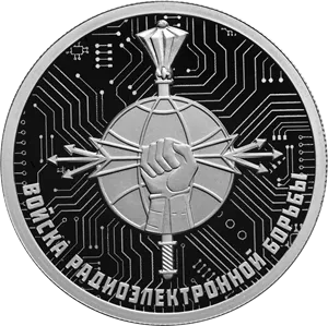Реверс: рельефное изображение малой эмблемы управления радиоэлектронной борьбы Генерального штаба Вооруженных Сил Российской Федерации на фоне стилизованного изображения печатной платы, выполненного в технике лазерного матирования; внизу по окружности – рельефная надпись «ВОЙСКА РАДИОЭЛЕКТРОННОЙ БОРЬБЫ».